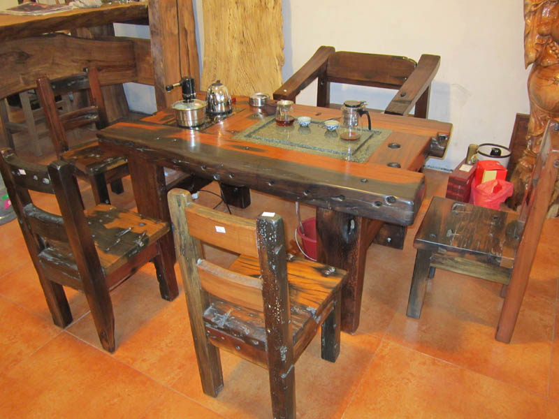 船木家私产品种类丰富,从沙发、床、茶几、餐台、办公桌椅,到各类家居装饰品一应俱全。所有家具均保留着原古船木特有的纹理和本色,造型多以圆方为主、古拙朴素。最为神奇的是其表面散布着海水侵蚀过的伤痕和孔洞,真实折射出因岁月变迁所产生的沧桑之感。这些作为家具原料的古船木经受过海水的百年浸泡与雕琢,质地坚硬耐磨。 店内的每套家具都不重复,这是因为作为原料的每一段古船木都不相同。设计师根据其造型因材施制,尽可能按照拆卸下的木料原状进行拼接。例如,原来是块甲板,就直接拿来做桌面;原来是发动机转轴,就可以做成沙发扶手。每件家具成品都各有特点,绝对无法复制出一模一样的来,因而每件都是难得的艺术精品。